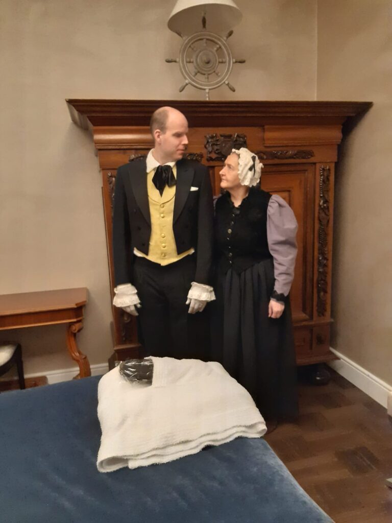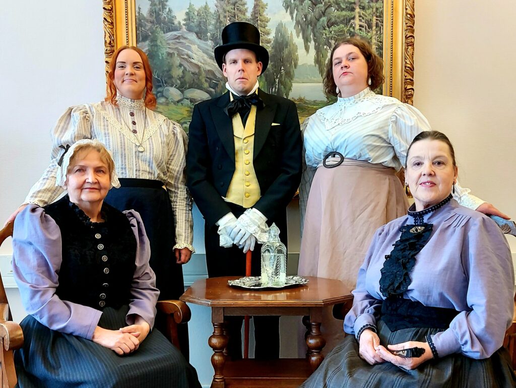 Sivuilla äiti Maria Nikolajevnan roolissa Tuula Lahdenmäki ja Marja-Terttu Kosonen, keskemmällä tyttärenä Mari-Johanna Knuutti ja Niina Kangas ja keskellä kosija Jukka Vieri. Kuva Maarit Honkonen.