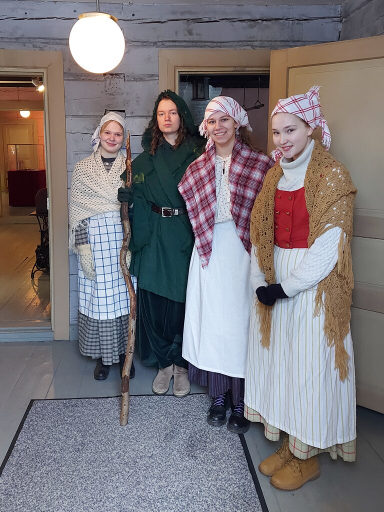 Kolme piikaa ja metsätonttu. Vasemmalta Jenni Mannila, Viola Maunuksela, Jenni Halkosaari ja Johanna Polvi. Kuva: Maarit Honkonen.